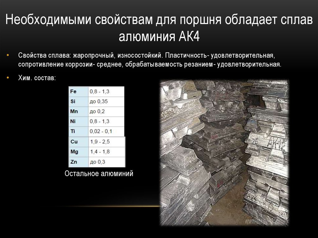 Необходимыми свойствам для поршня обладает сплавалюминия АК4