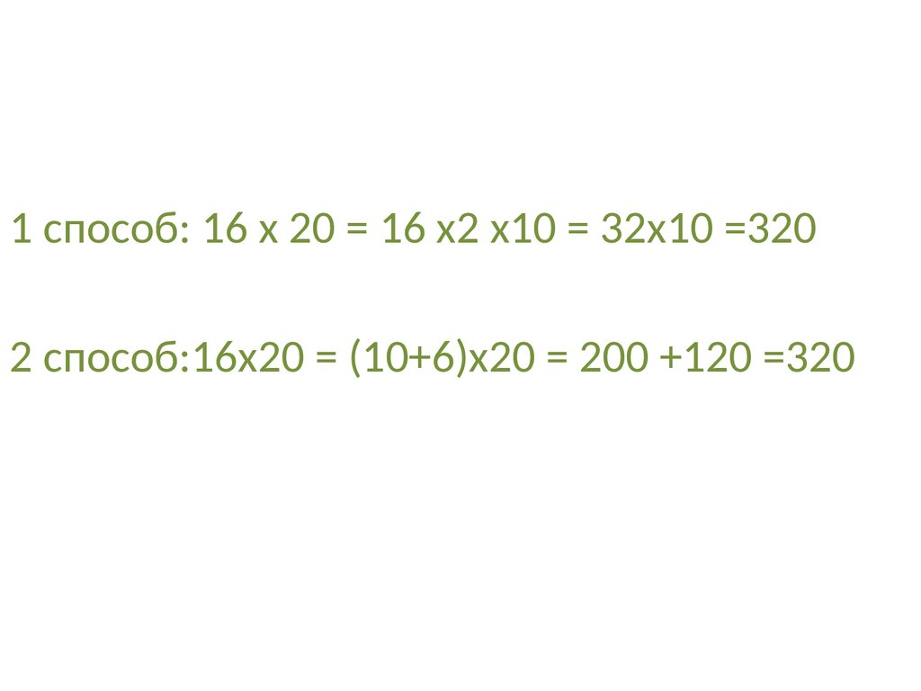 1 способ: 16 х 20 = 16 х2 х10 = 32х10 =3202 способ:16х20 = (10+6)х20 = 200 +120 =320