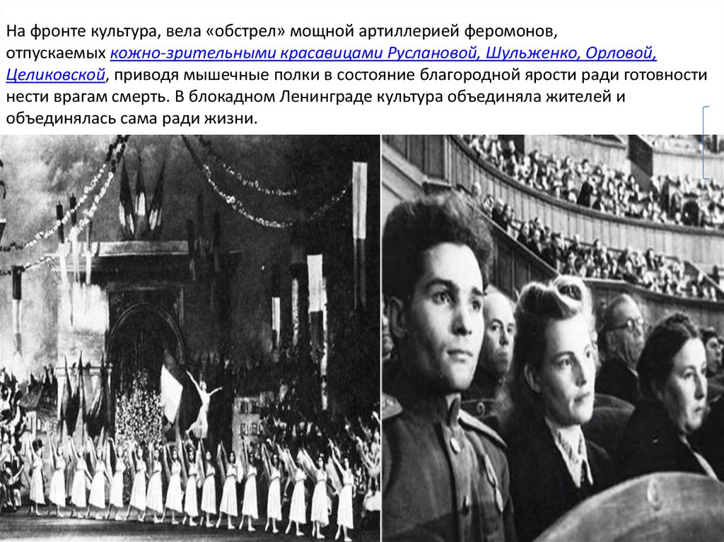На фронте культура, вела «обстрел» мощной артиллерией феромонов,отпускаемых кожно-зрительными красавицами Руслановой, Шульженко, Орловой,