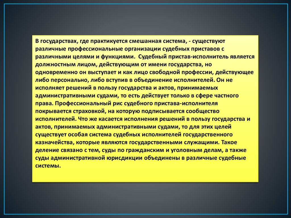 В государствах, где практикуется смешанная система, - существуютразличные профессиональные организации судебных приставов с