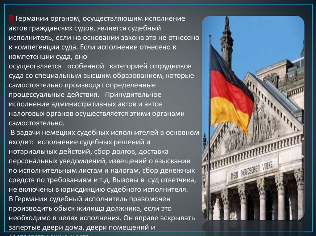 В Германии органом, осуществляющим исполнениеактов гражданских судов, является судебный