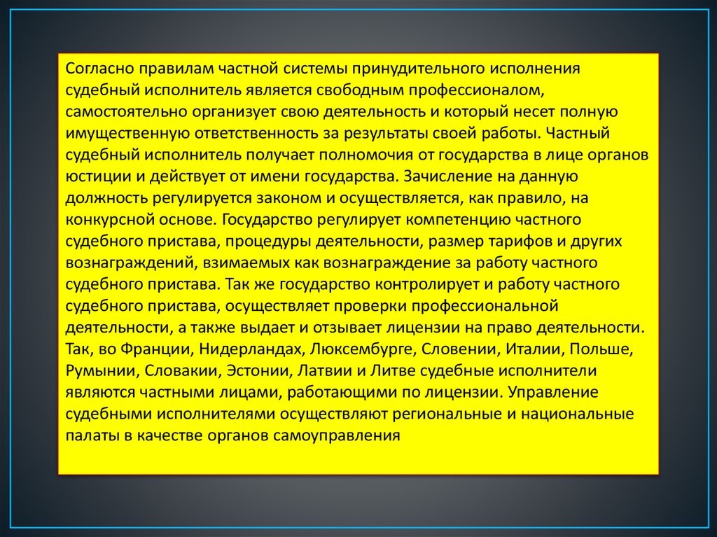 Согласно правилам частной системы принудительного исполнениясудебный исполнитель является свободным профессионалом,