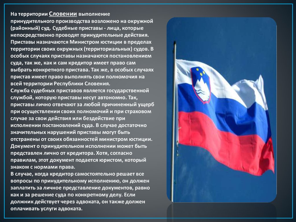 На территории Словении выполнениепринудительного производства возложено на окружной