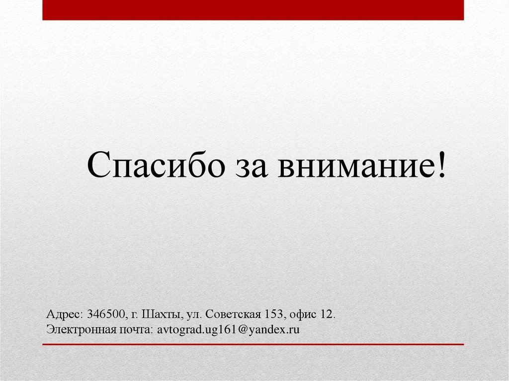 Спасибо за внимание!Адрес: 346500, г. Шахты, ул. Советская 153, офис 12.