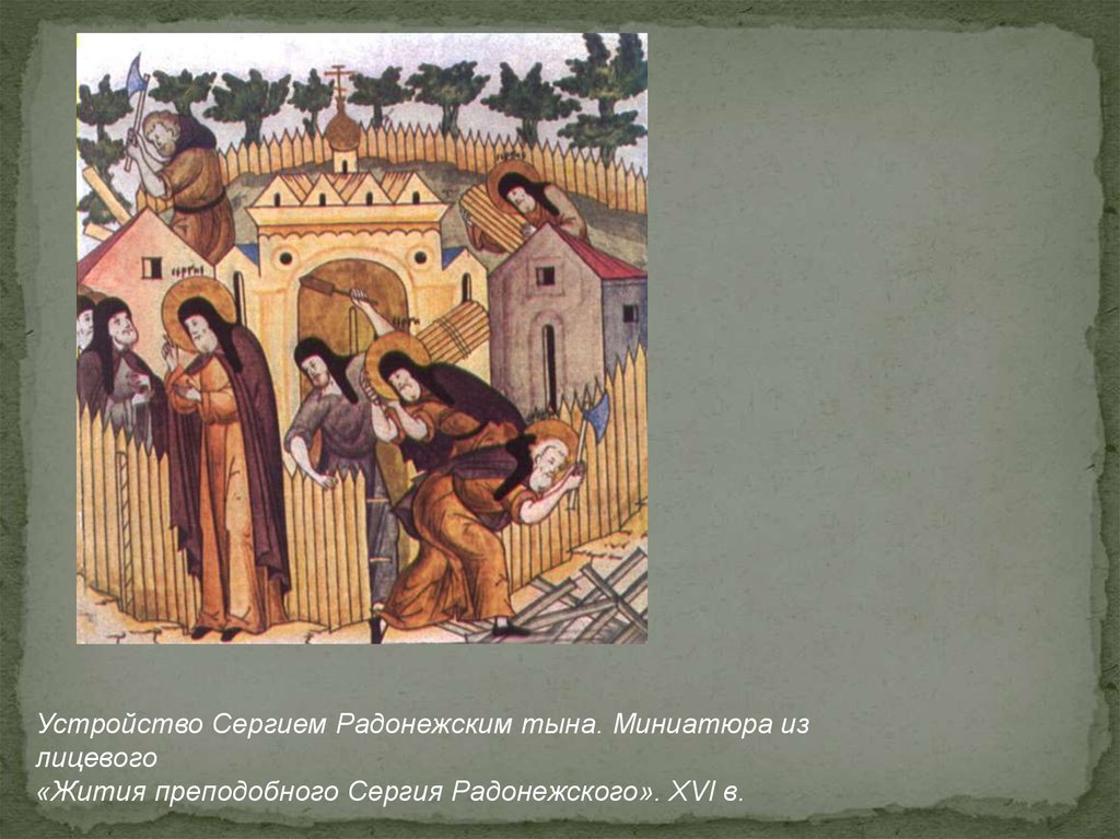 Устройство Сергием Радонежским тына. Миниатюра излицевого