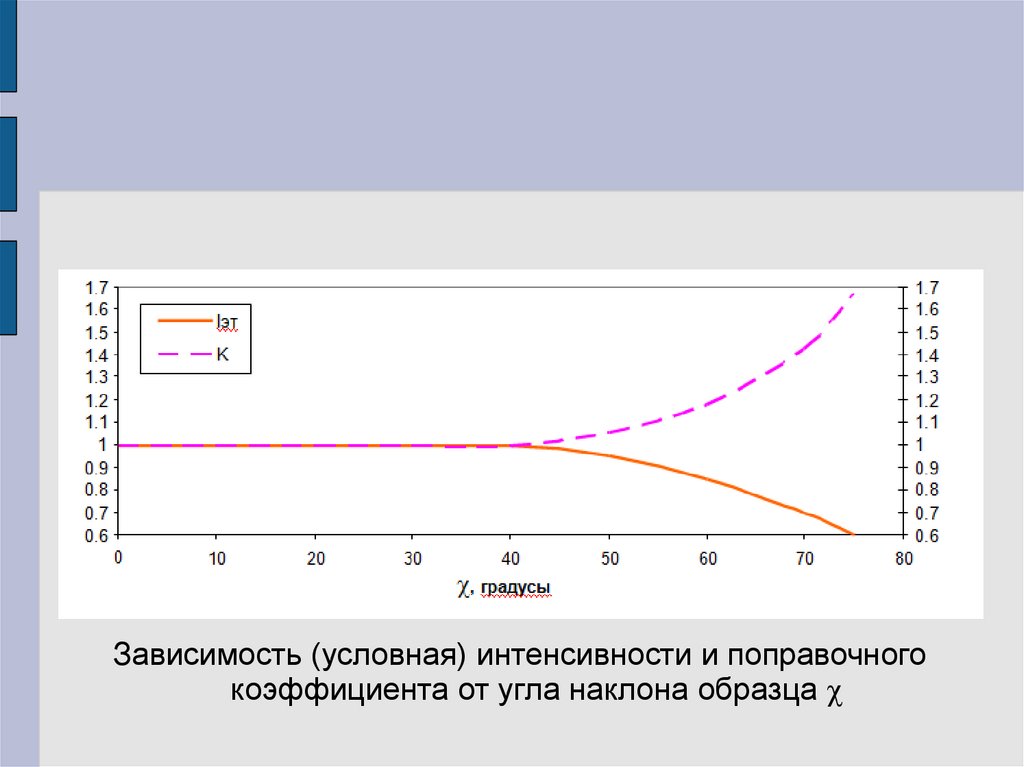 Зависимость (условная) интенсивности и поправочногокоэффициента от угла наклона образца