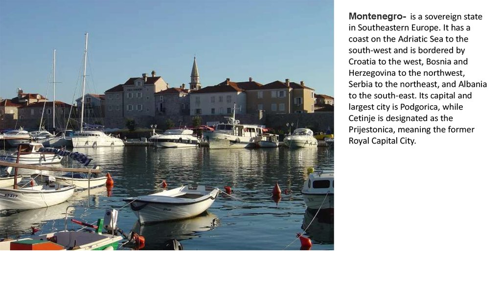 Montenegro- is a sovereign statein Southeastern Europe. It has a