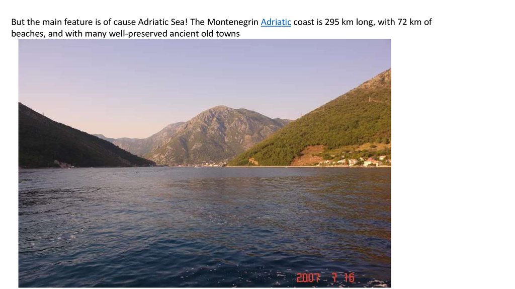But the main feature is of cause Adriatic Sea! The Montenegrin Adriatic coast is 295 km long, with 72 km ofbeaches, and with many well-preserved ancient old towns