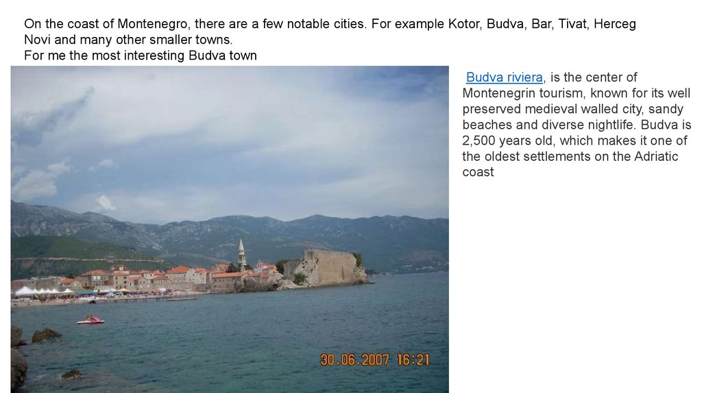 Оn the coast of Montenegro, there are a few notable cities. For example Kotor, Budva, Bar, Tivat, HercegNovi and many other smaller towns.