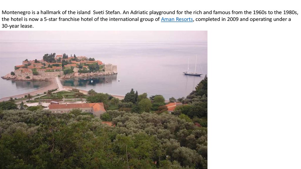 Montenegro is a hallmark of the island Sveti Stefan. An Adriatic playground for the rich and famous from the 1960s to the 1980s,the hotel is now a 5-star franchise hotel of the international group of Aman Resorts, completed in 2009 and operating under a