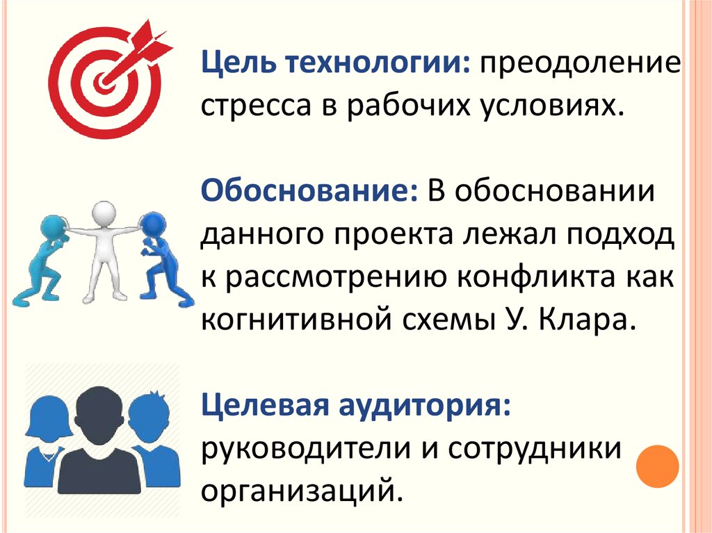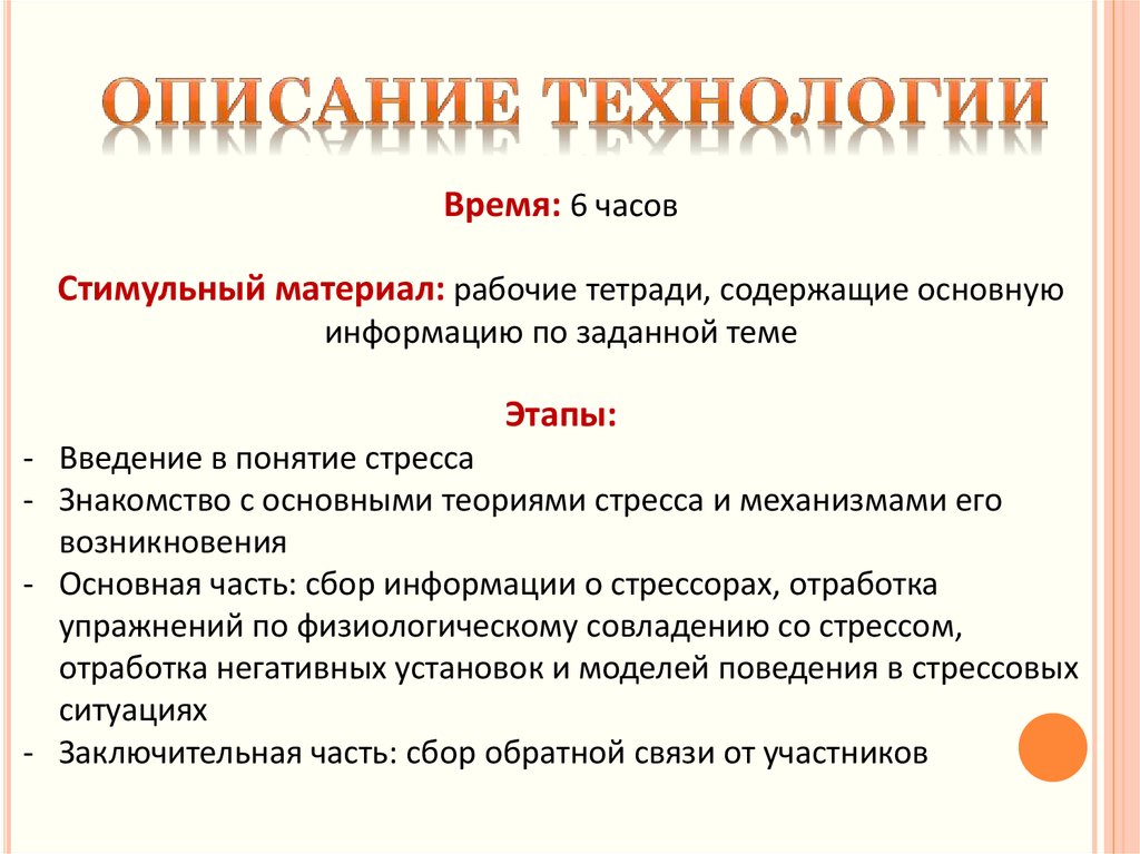 Цель технологии: преодолениестресса в рабочих условиях.
