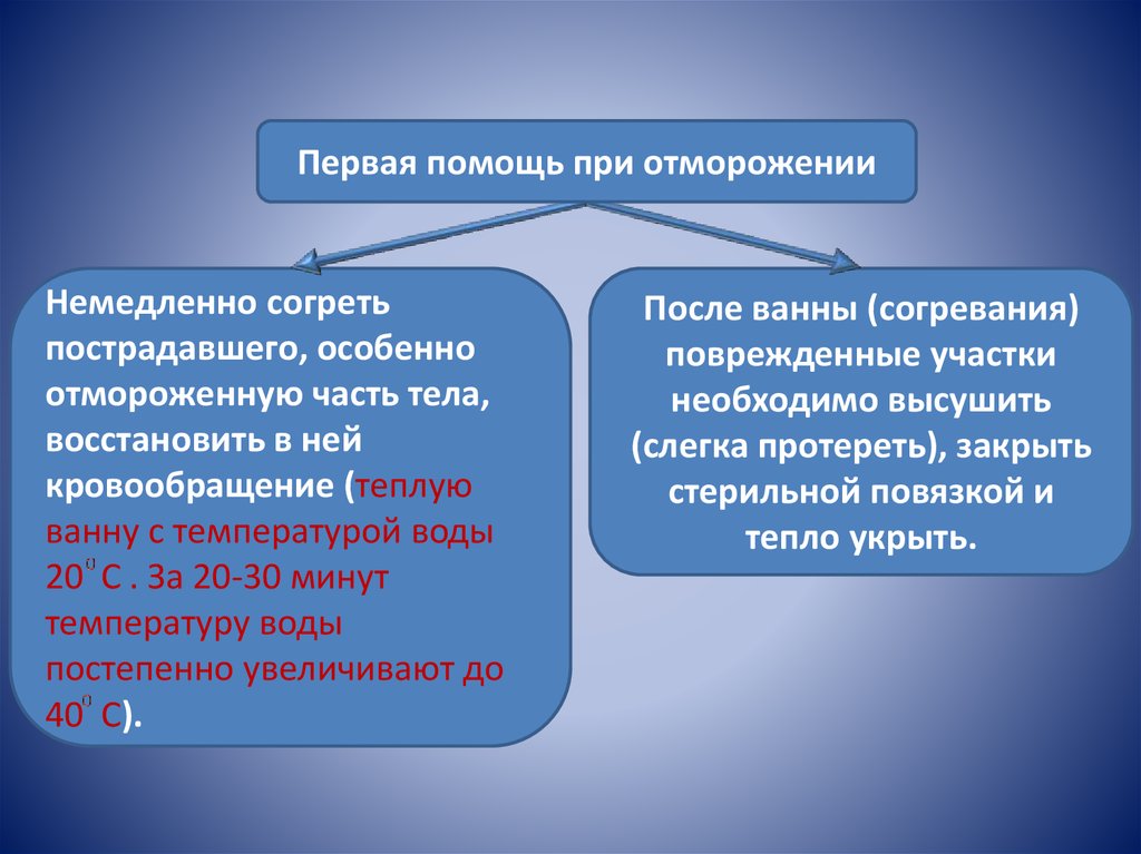 Первая помощь при отмороженииНемедленно согреть