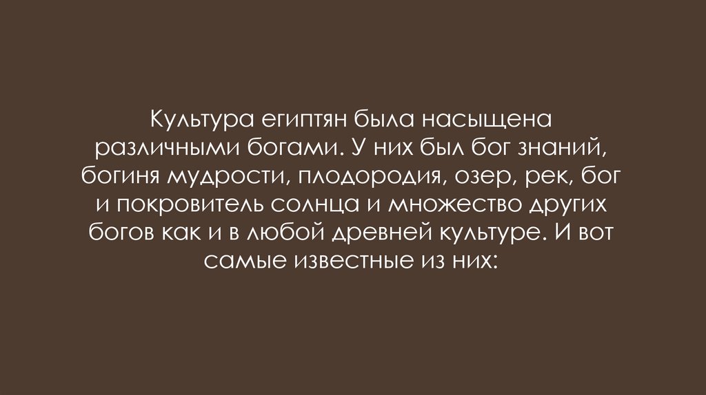 Культура египтян была насыщенаразличными богами. У них был бог знаний,