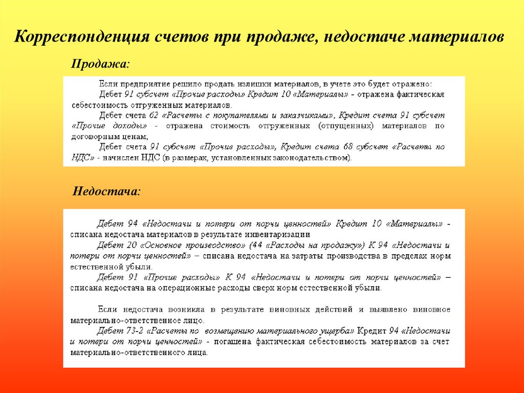 Корреспонденция счетов при продаже, недостаче материаловПродажа: