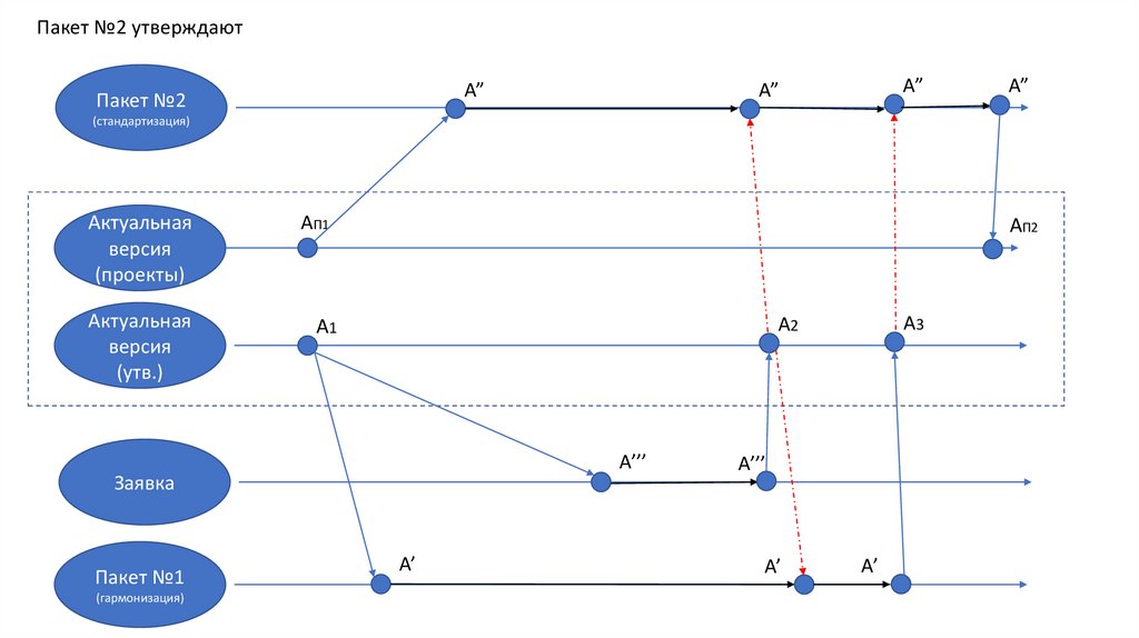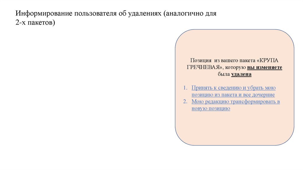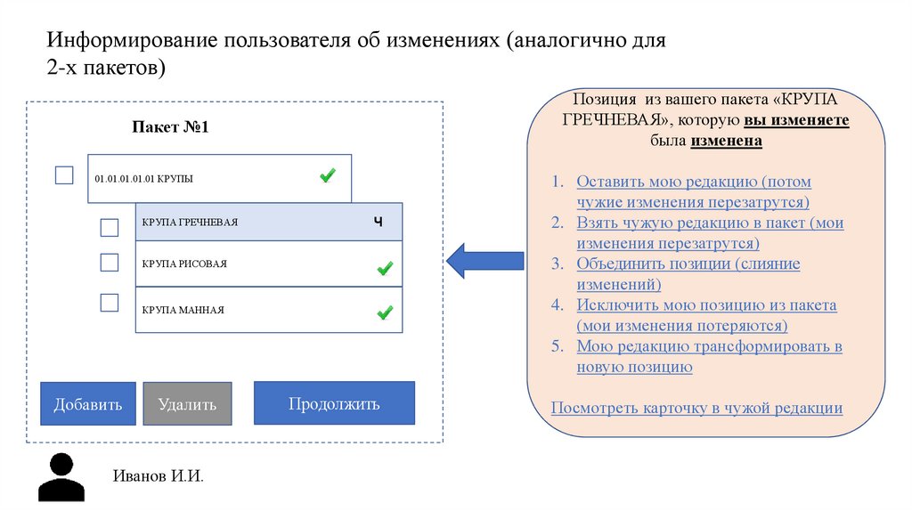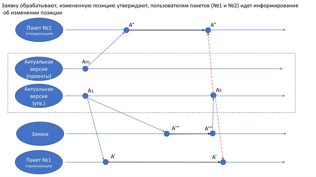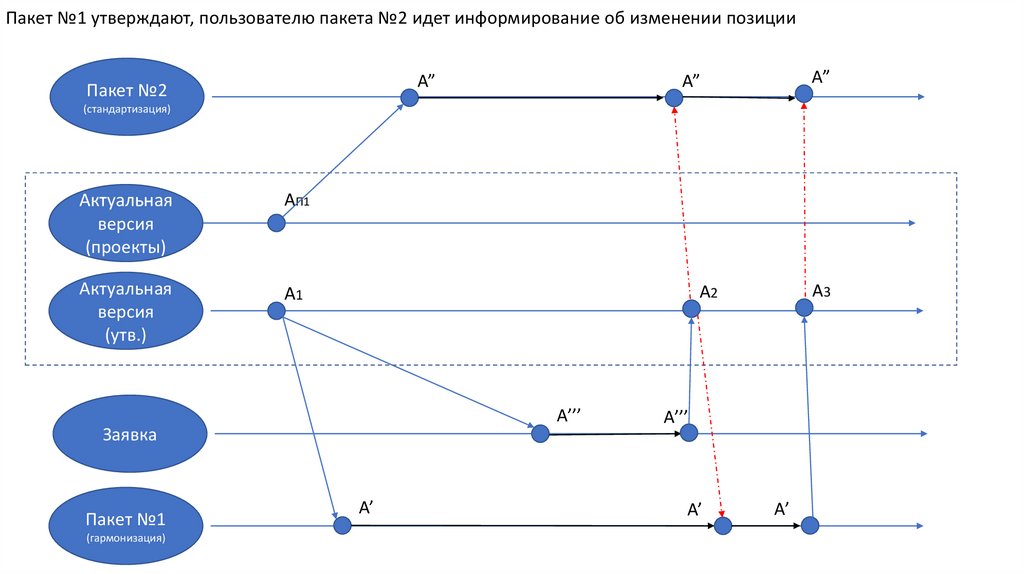 Пакет №1 утверждают, пользователю пакета №2 идет информирование об изменении позицииА”