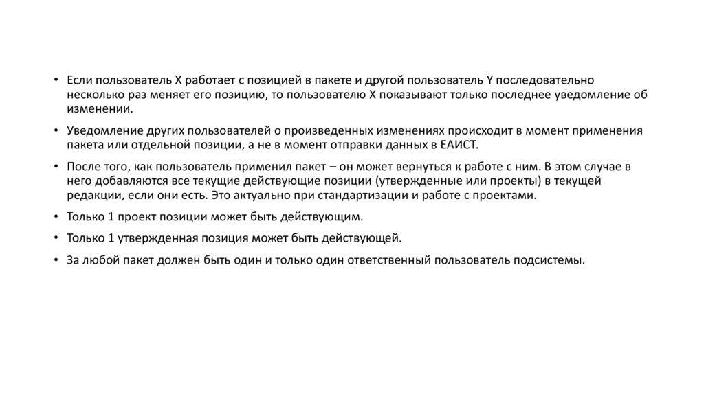 • Если пользователь X работает с позицией в пакете и другой пользователь Y последовательнонесколько раз меняет его позицию, то пользователю X показывают только последнее уведомление об