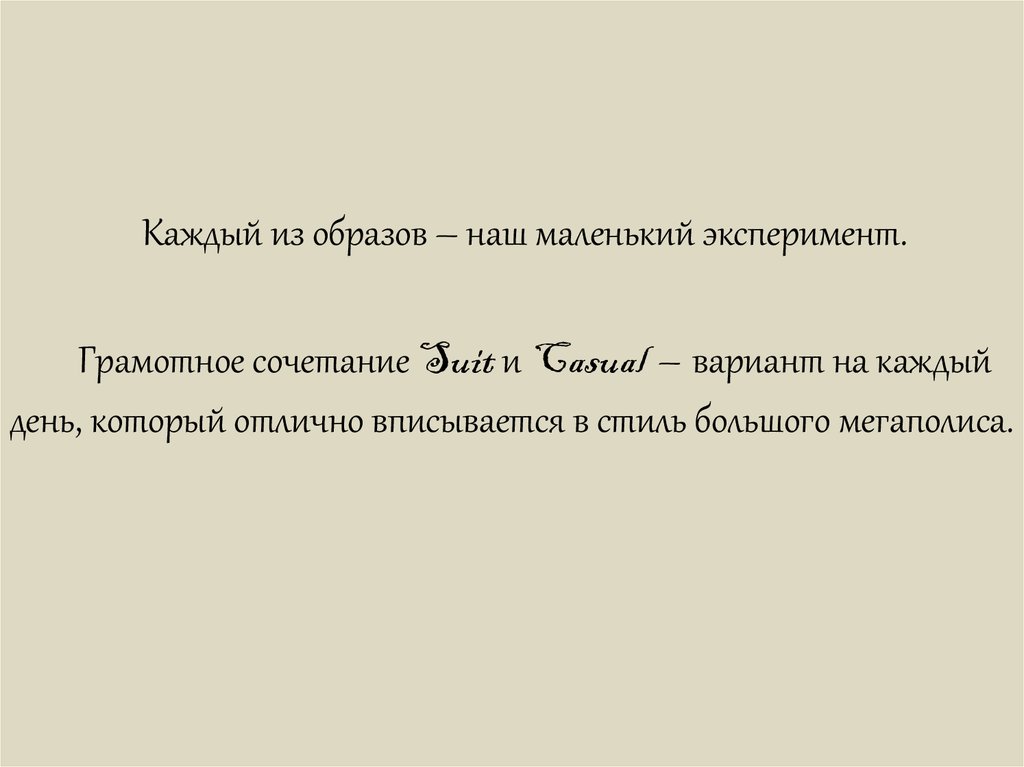 Каждый из образов – наш маленький эксперимент.Грамотное сочетание Suit и Casual – вариант на каждый