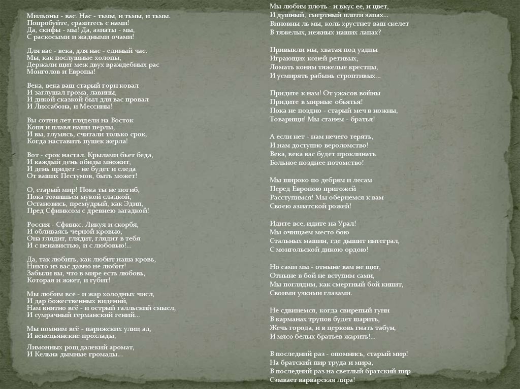 Противостояние Востока и Запада. А. Блок "Скифы"