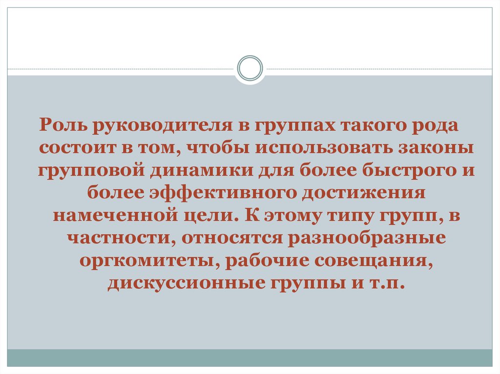 Роль руководителя в группах такого родасостоит в том, чтобы использовать законы