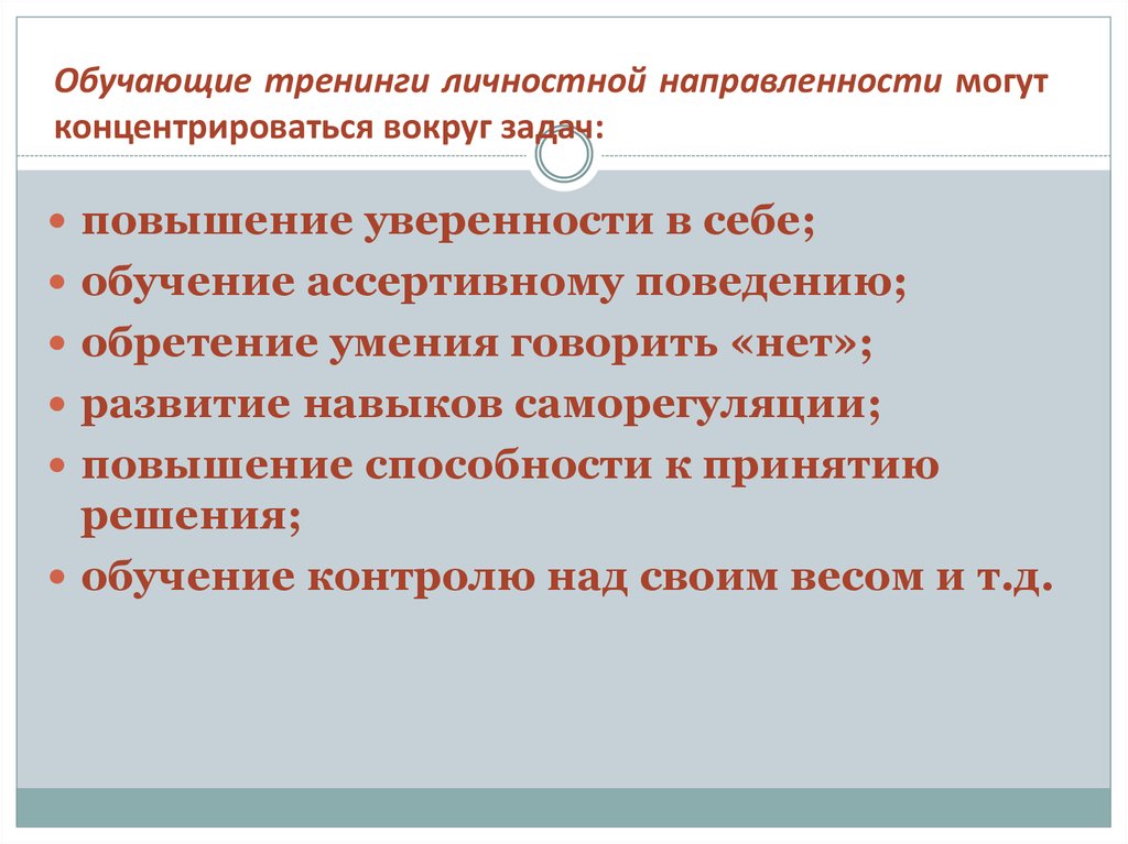 Обучающие тренинги личностной направленности могутконцентрироваться вокруг задач: