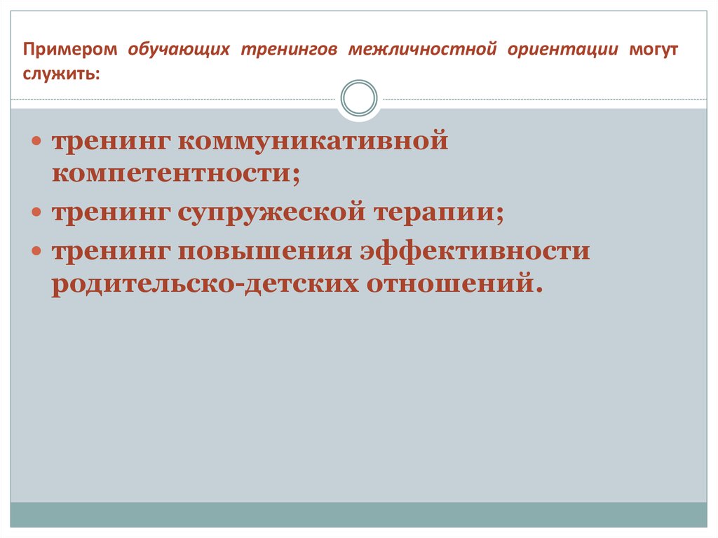 Примером обучающих тренингов межличностной ориентации могутслужить: