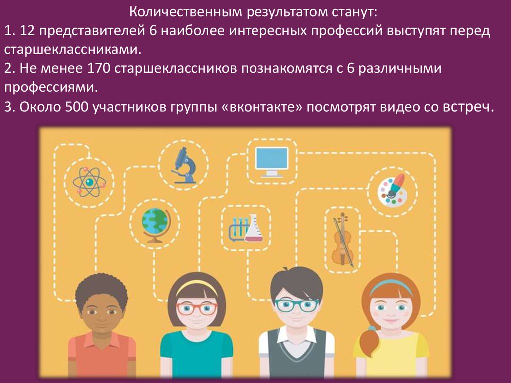 Количественным результатом станут:1. 12 представителей 6 наиболее интересных профессий выступят перед