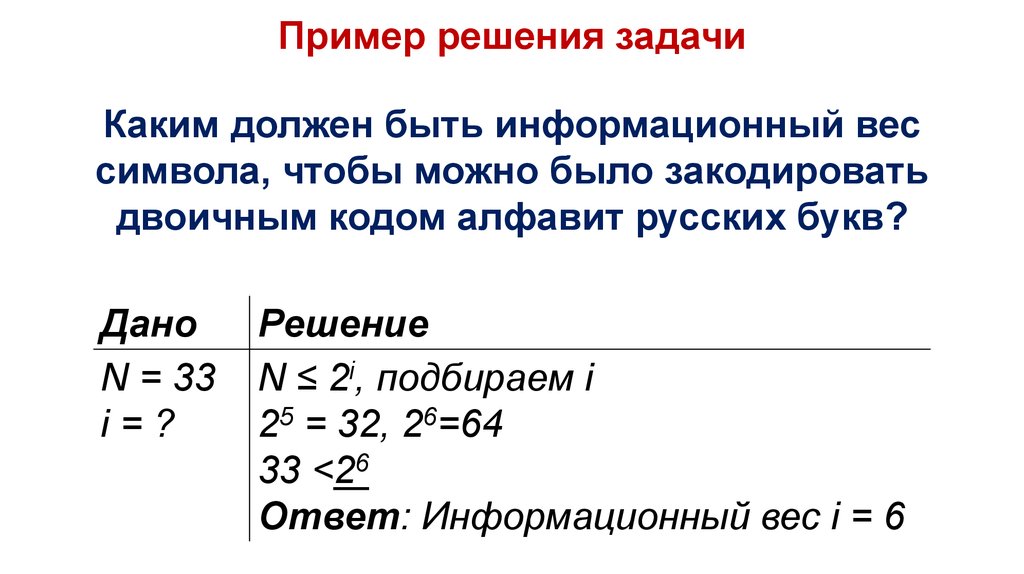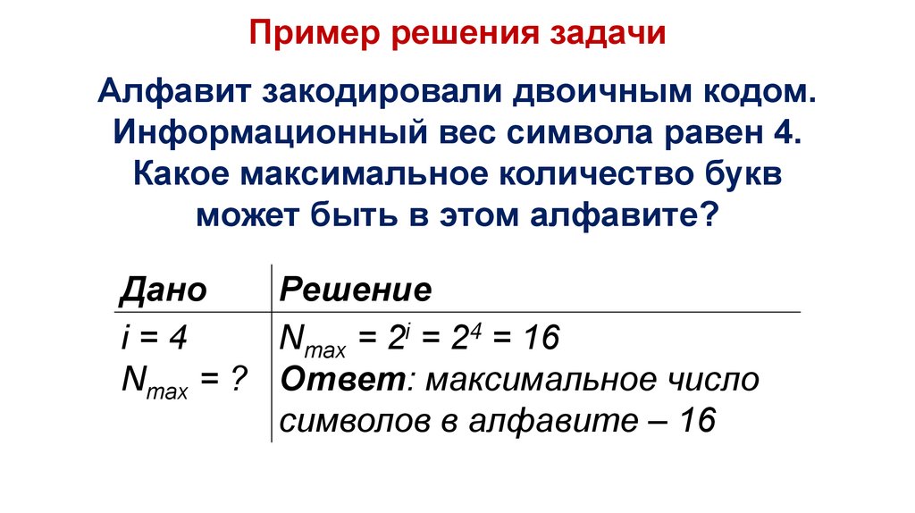 Пример решения задачиАлфавит закодировали двоичным кодом.