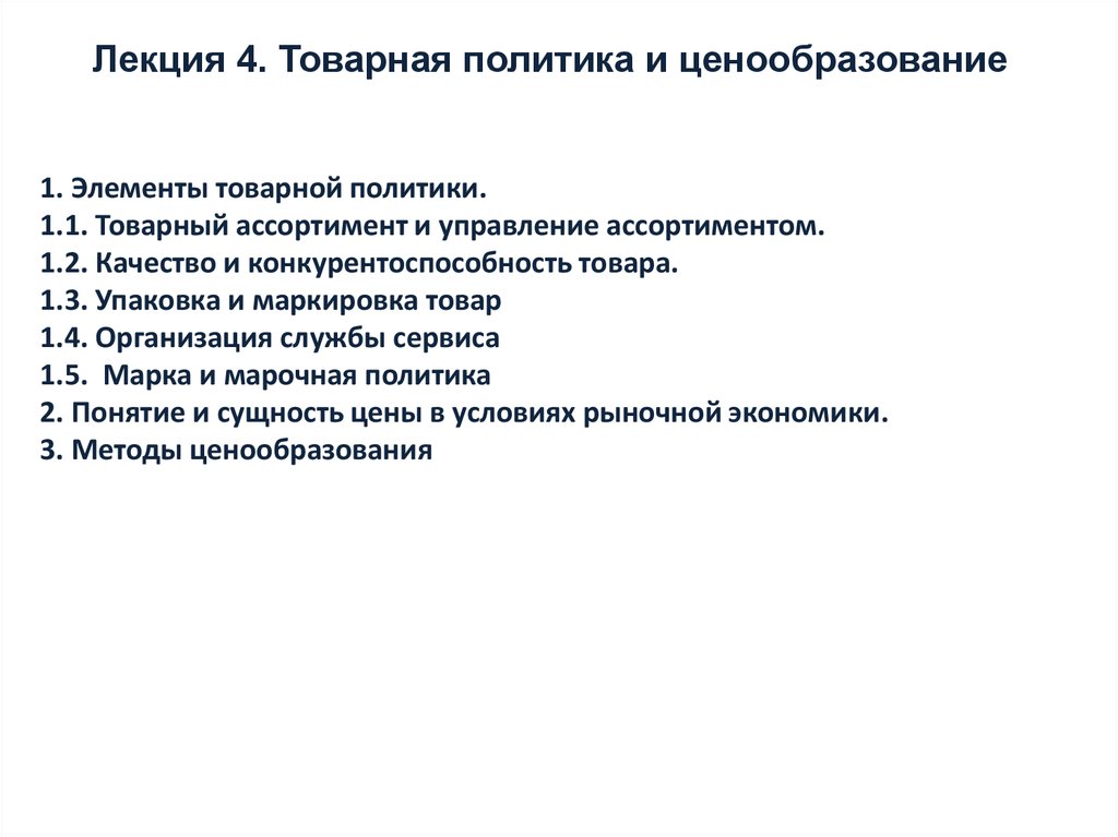 Лекция 4. Товарная политика и ценообразование1. Элементы товарной политики.