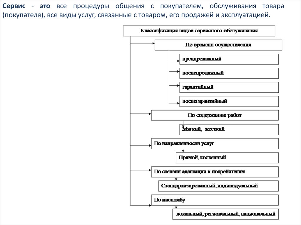 Сервис - это все процедуры общения с покупателем, обслуживания товара(покупателя), все виды услуг, связанные с товаром, его продажей и эксплуатацией.