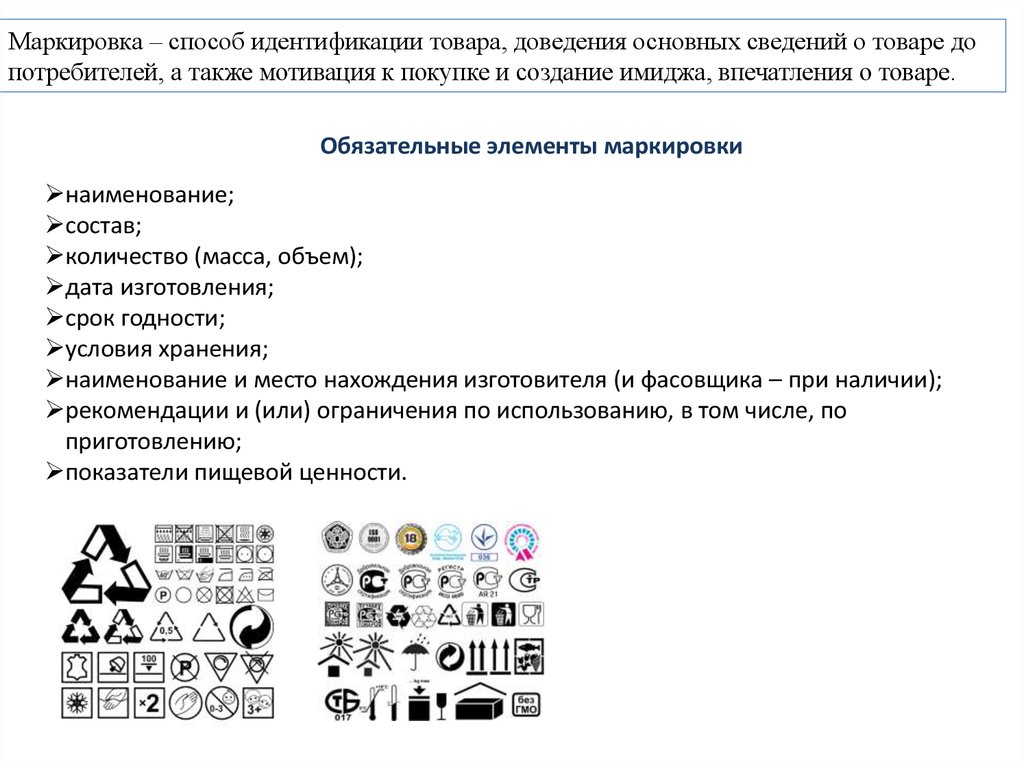 Маркировка – способ идентификации товара, доведения основных сведений о товаре допотребителей, а также мотивация к покупке и создание имиджа, впечатления о товаре.