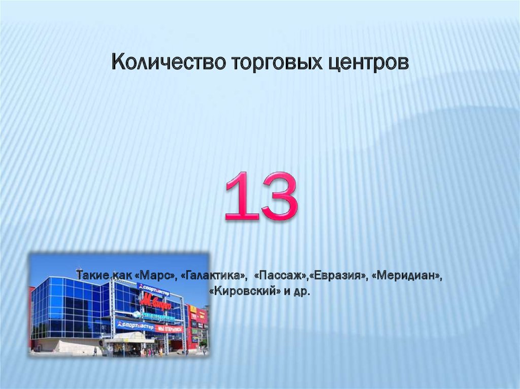 Количество торговых центровТакие как «Марс», «Галактика», «Пассаж»,«Евразия», «Меридиан»,