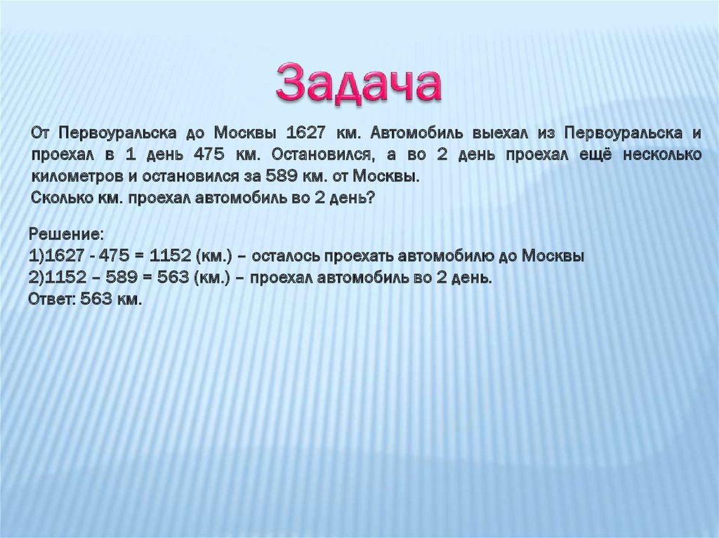 От Первоуральска до Москвы 1627 км. Автомобиль выехал из Первоуральска ипроехал в 1 день 475 км. Остановился, а во 2 день проехал ещё несколько