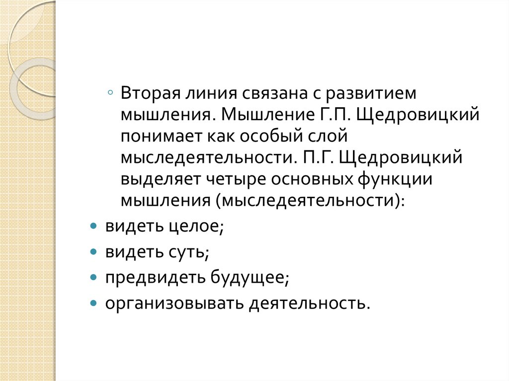 ◦ Вторая линия связана с развитиеммышления. Мышление Г.П. Щедровицкий
