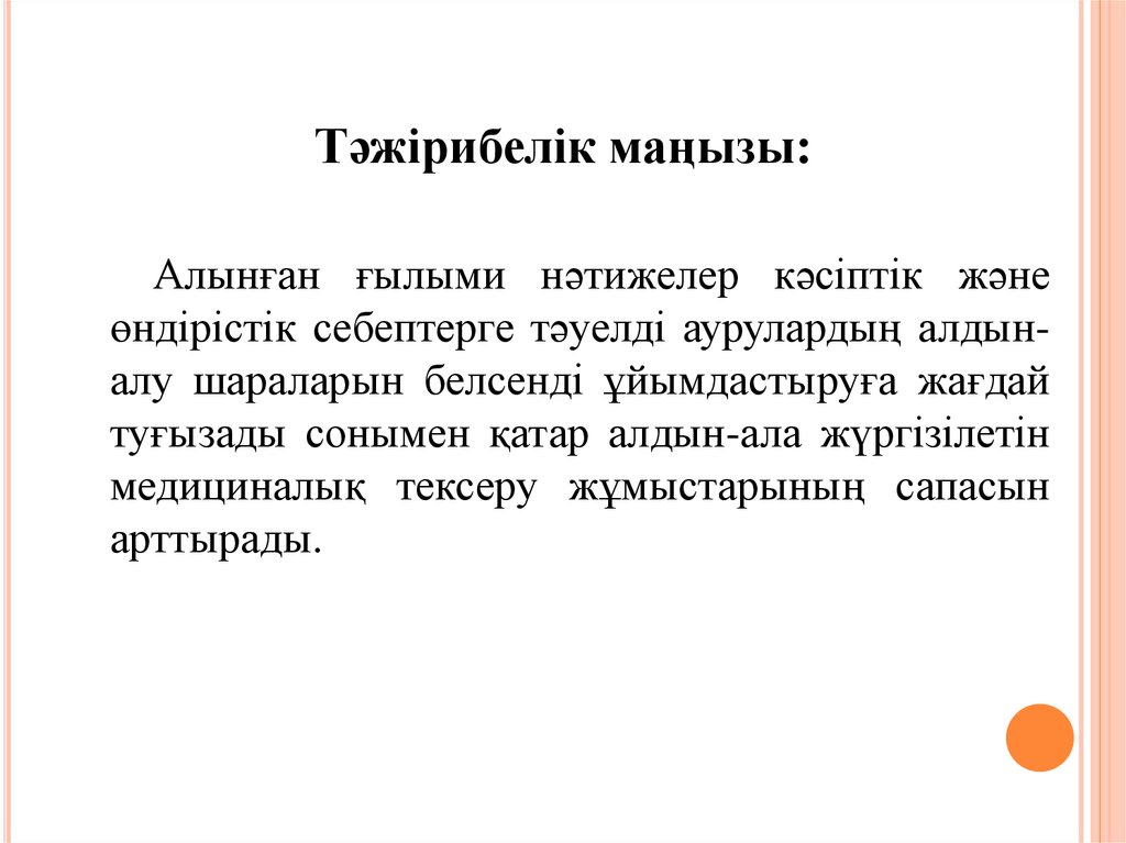 Тәжірибелік маңызы:Алынған ғылыми нәтижелер кәсіптік және