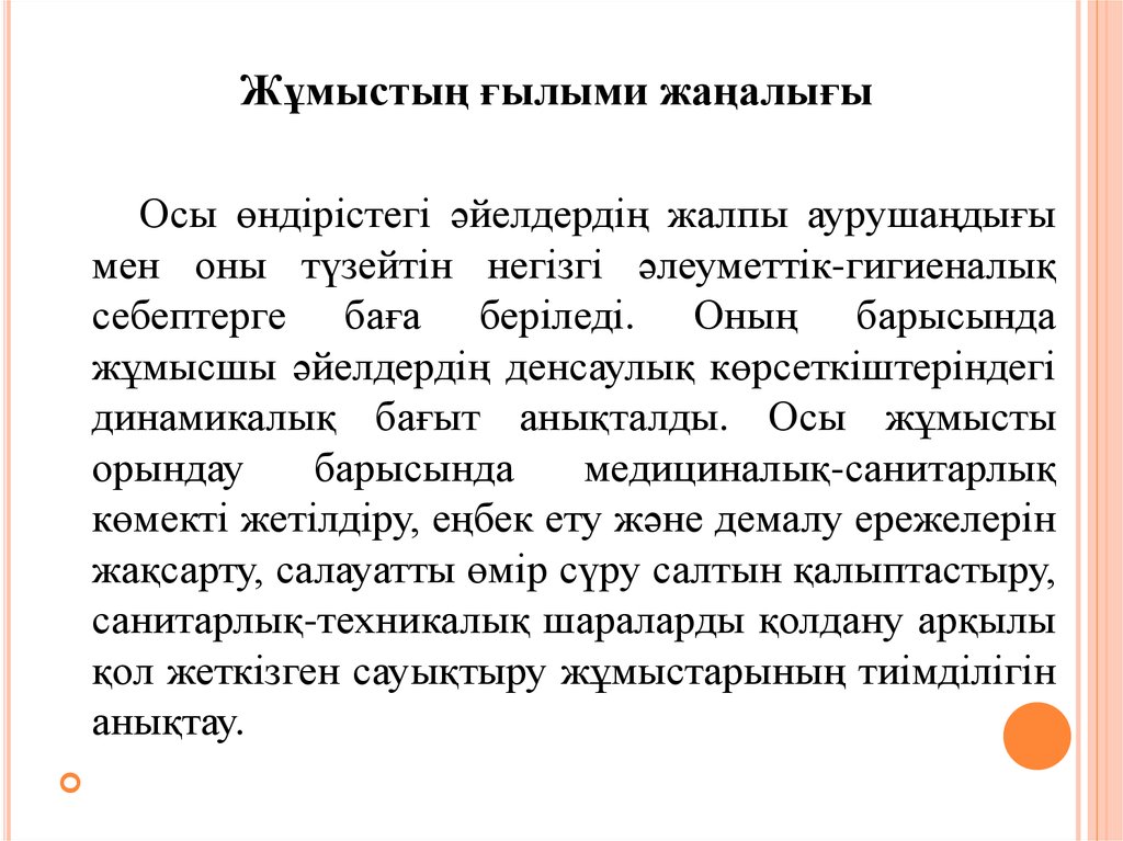 Жұмыстың ғылыми жаңалығыОсы өндірістегі әйелдердің жалпы аурушаңдығы