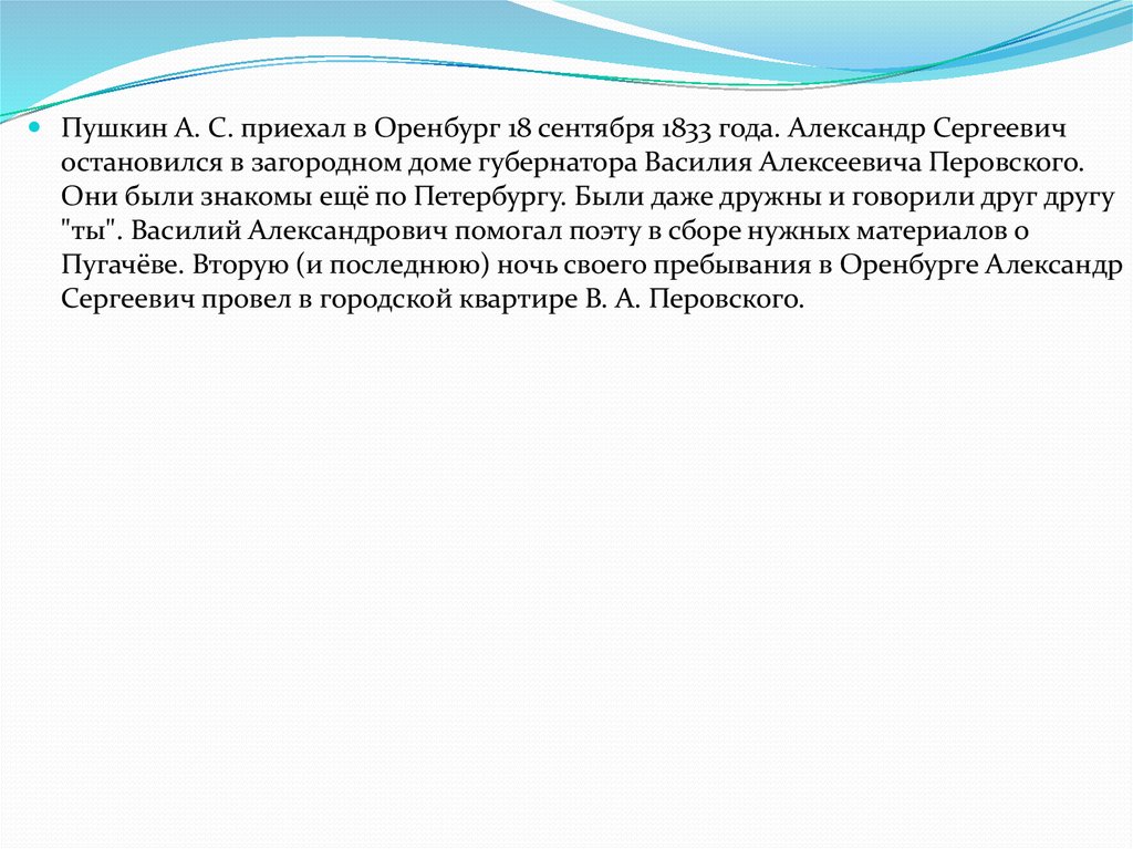 Пушкин А. С. приехал в Оренбург 18 сентября 1833 года. Александр Сергеевичостановился в загородном доме губернатора Василия Алексеевича Перовского.