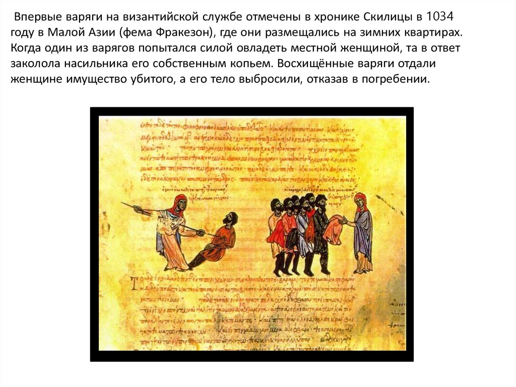 Впервые варяги на византийской службе отмечены в хронике Скилицы в 1034году в Малой Азии (фема Фракезон), где они размещались на зимних квартирах.