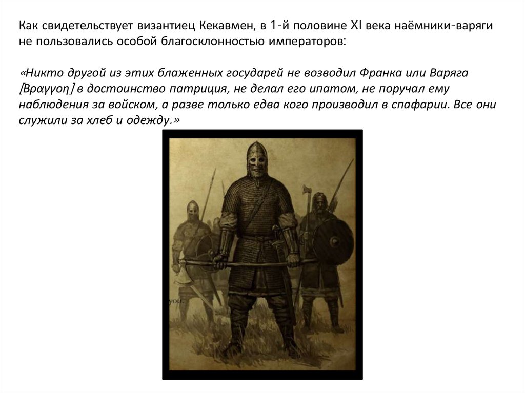 Как свидетельствует византиец Кекавмен, в 1-й половине XI века наёмники-варягине пользовались особой благосклонностью императоров: