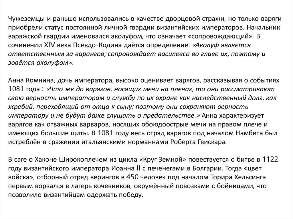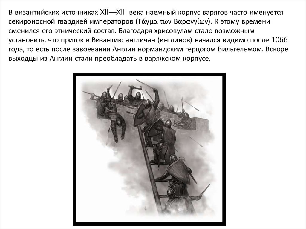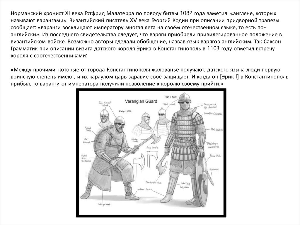 Норманский хронист XI века Готфрид Малатерра по поводу битвы 1082 года заметил: «англяне, которыхназывают варангами». Византийский писатель XV века Георгий Кодин при описании придворной трапезы