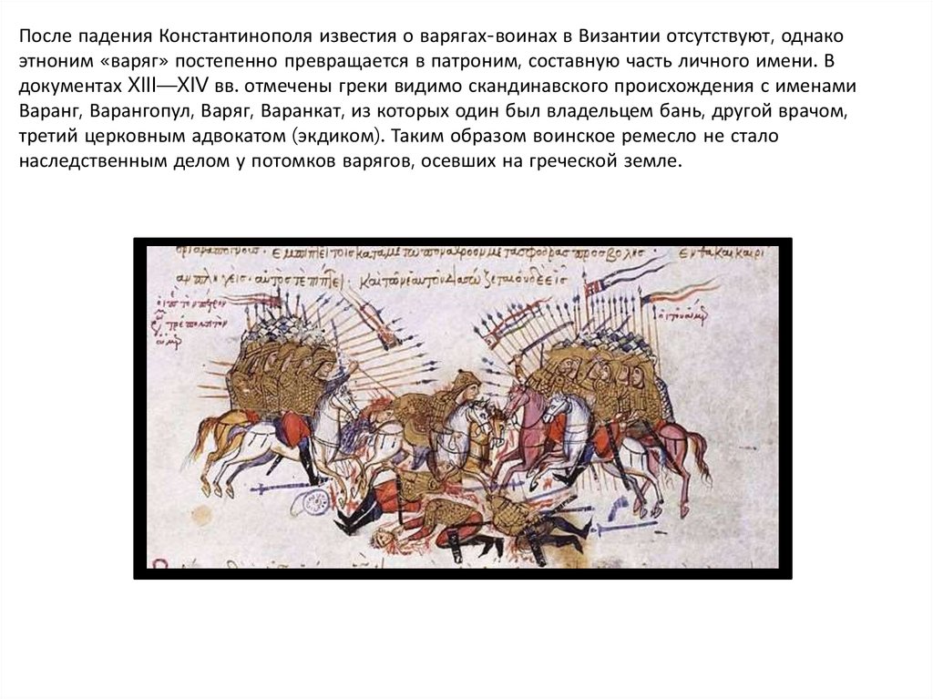 После падения Константинополя известия о варягах-воинах в Византии отсутствуют, однакоэтноним «варяг» постепенно превращается в патроним, составную часть личного имени. В