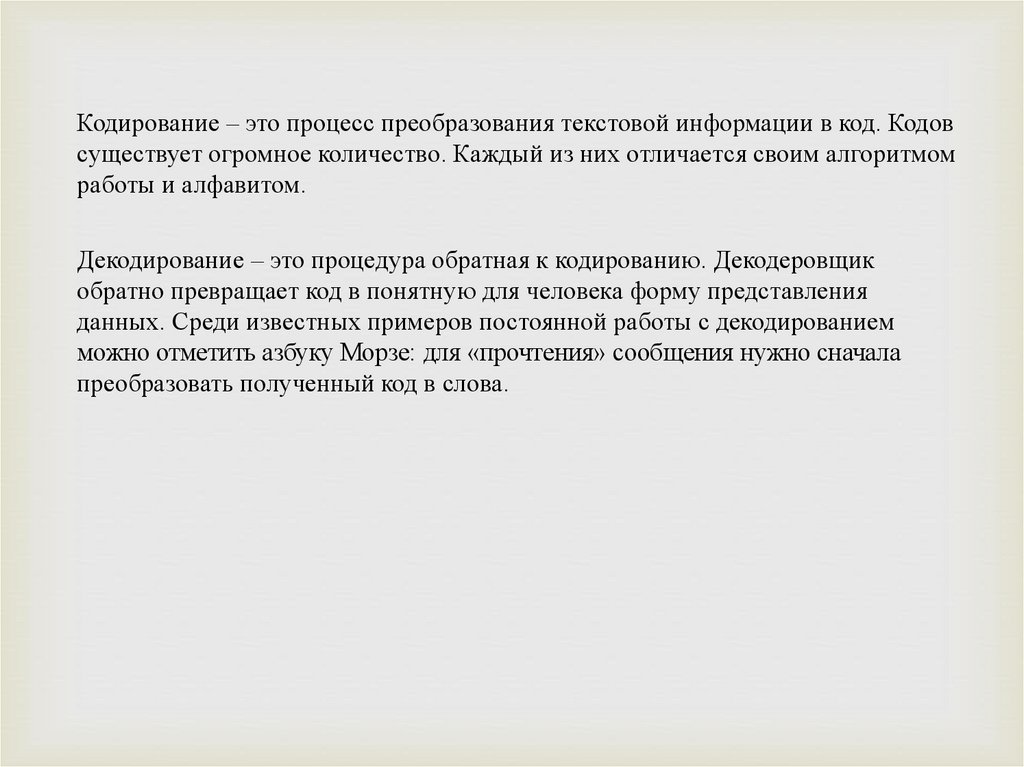 Кодирование – это процесс преобразования текстовой информации в код. Кодовсуществует огромное количество. Каждый из них отличается своим алгоритмом