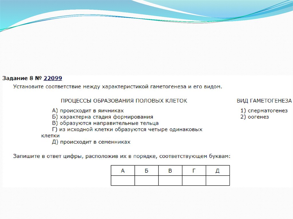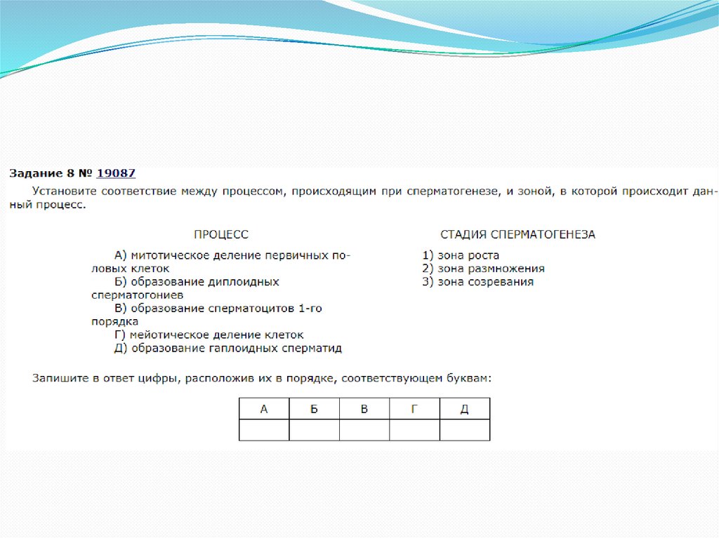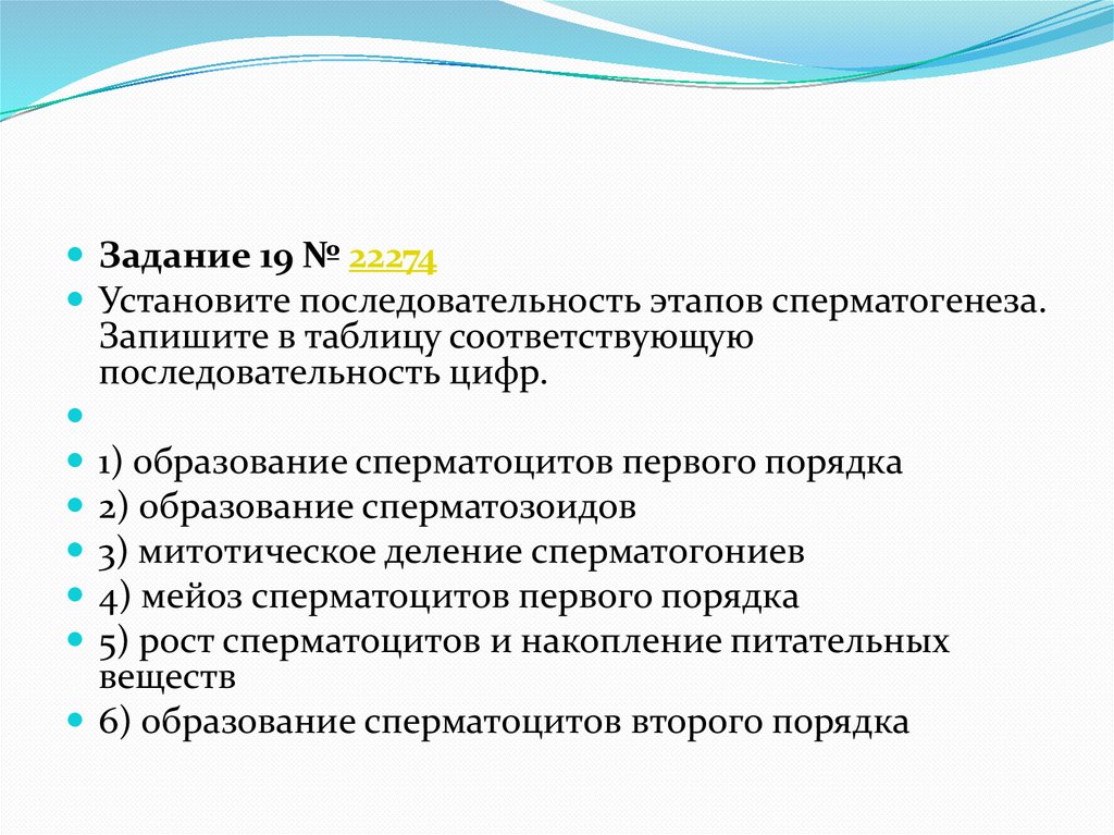 Задание 19 № 22274Установите последовательность этапов сперматогенеза.