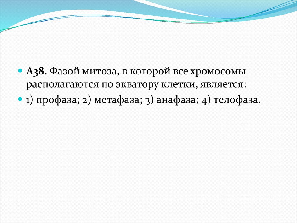 А38. Фазой митоза, в которой все хромосомырасполагаются по экватору клетки, является: