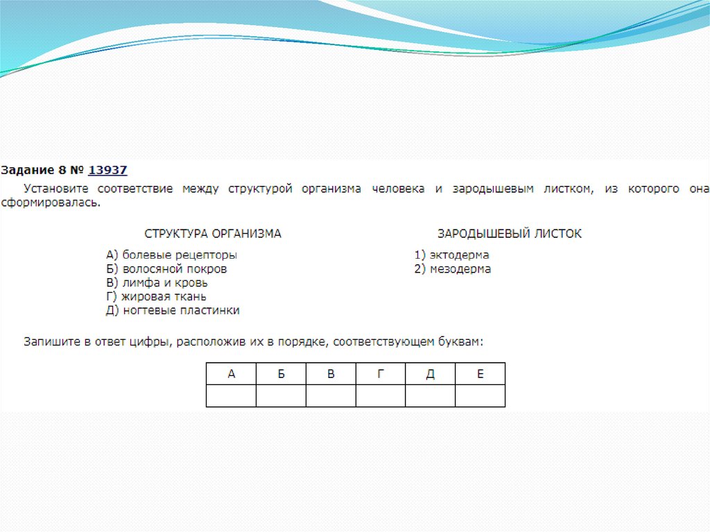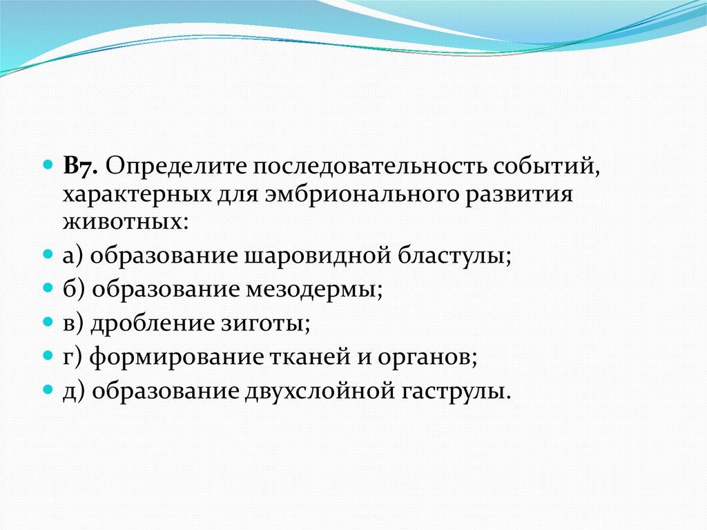 В7. Определите последовательность событий,характерных для эмбрионального развития