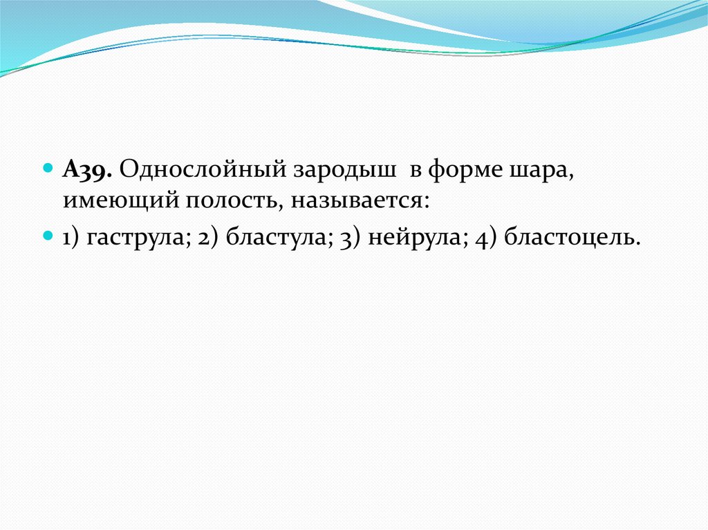 А39. Однослойный зародыш в форме шара,имеющий полость, называется:
