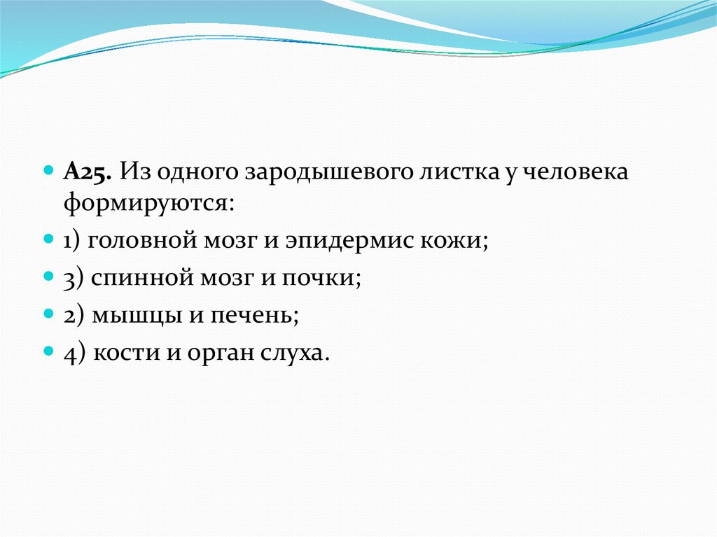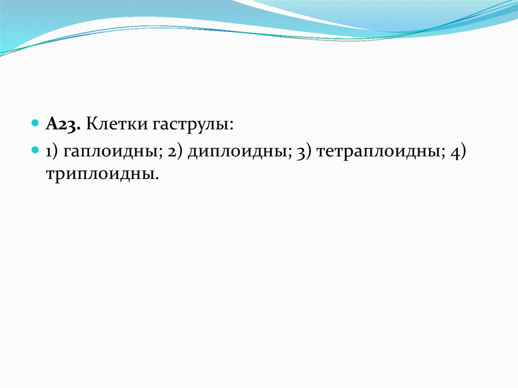 А23. Клетки гаструлы:1) гаплоидны; 2) диплоидны; 3) тетраплоидны; 4)