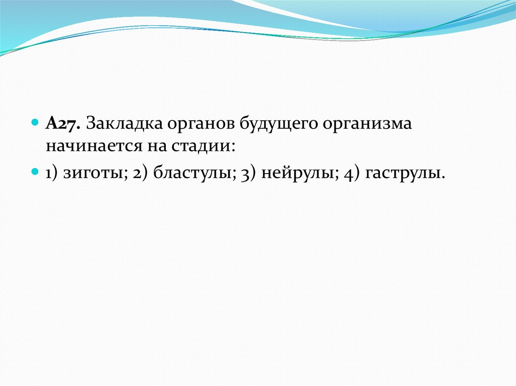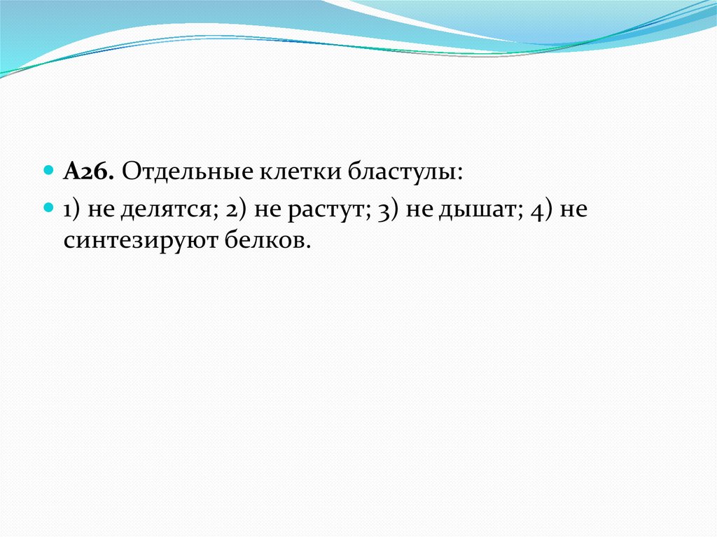 А26. Отдельные клетки бластулы:1) не делятся; 2) не растут; 3) не дышат; 4) не