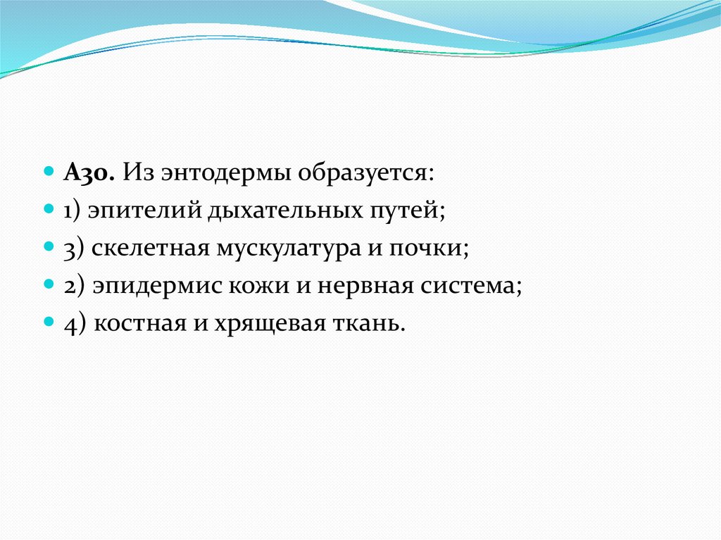 А30. Из энтодермы образуется:1) эпителий дыхательных путей;