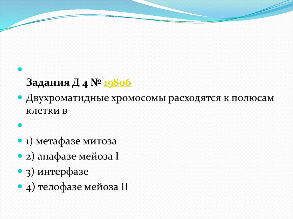 Задания Д 4 № 19806Двухроматидные хромосомы расходятся к полюсам