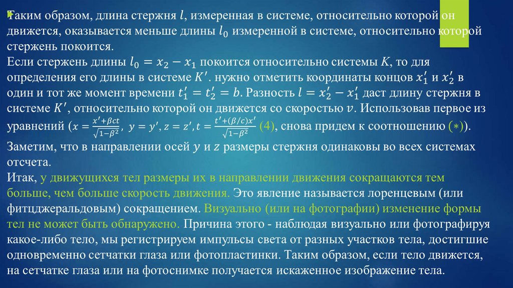 4. 2. Длина тел в разных системах. Рассмотрим стержень, расположенный вдоль оси x^′ и покоящийся относительно системы отсчета K^′.